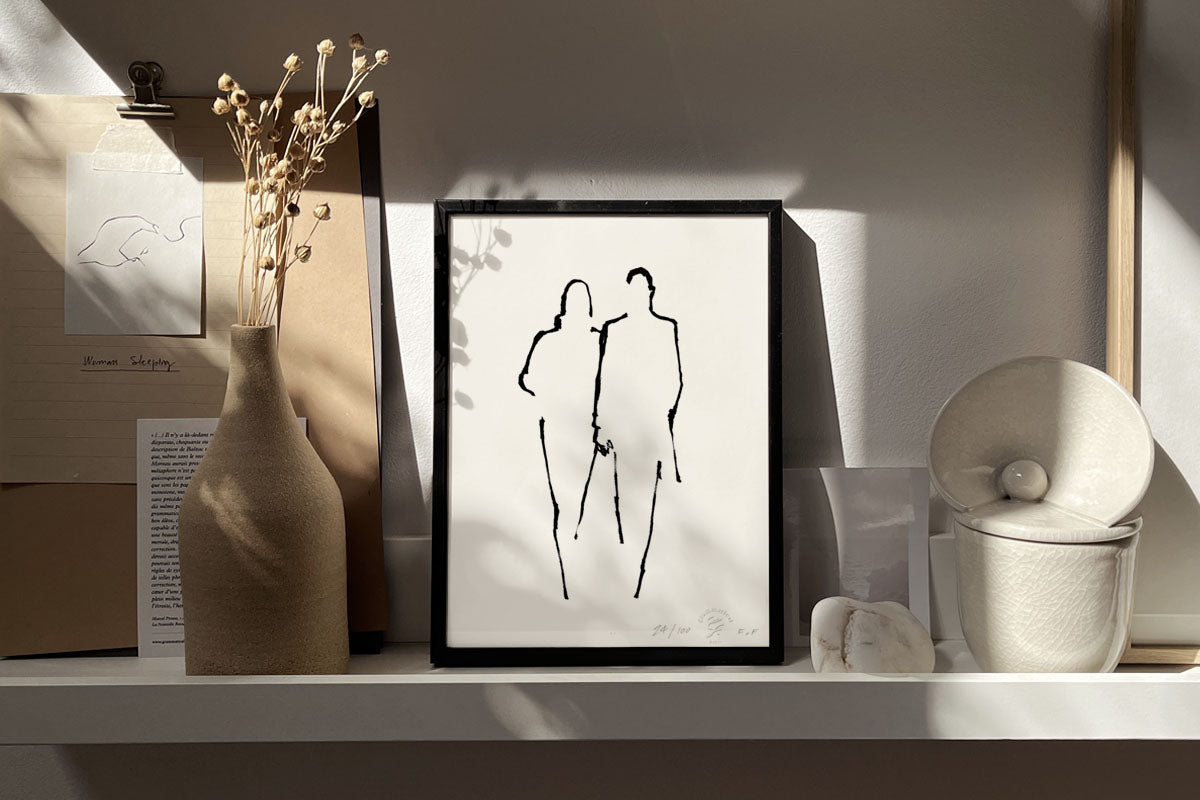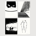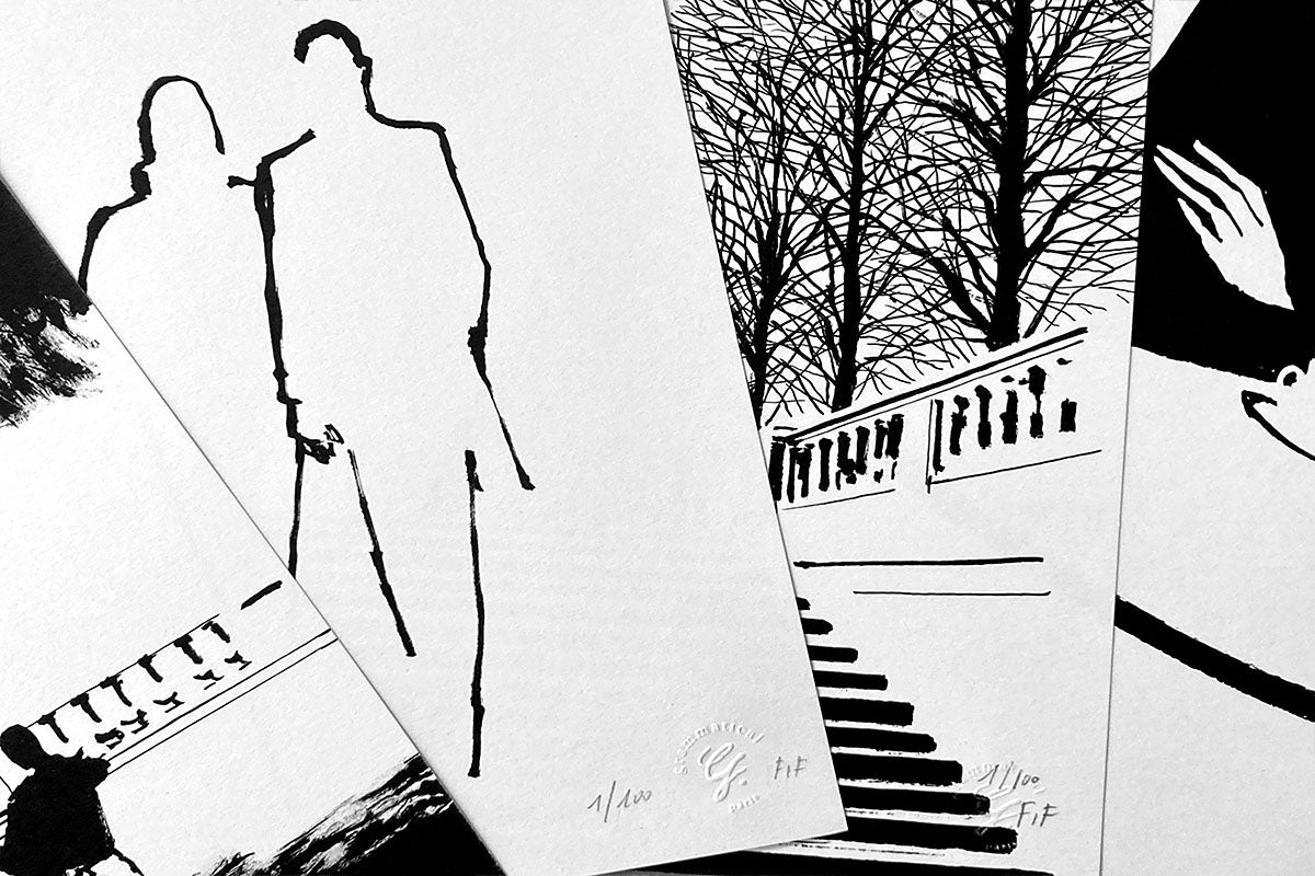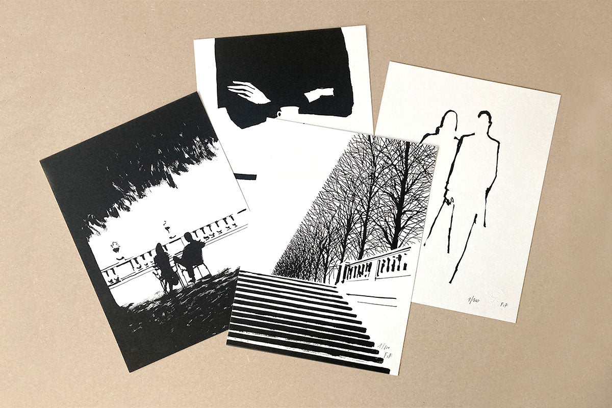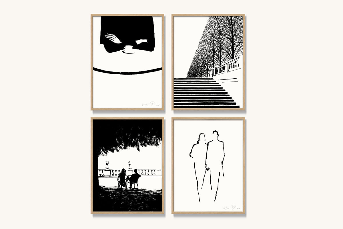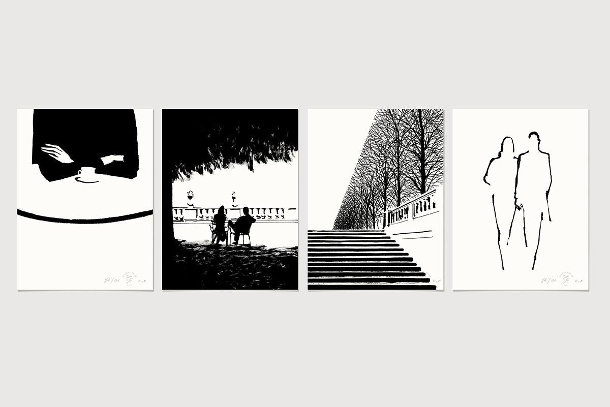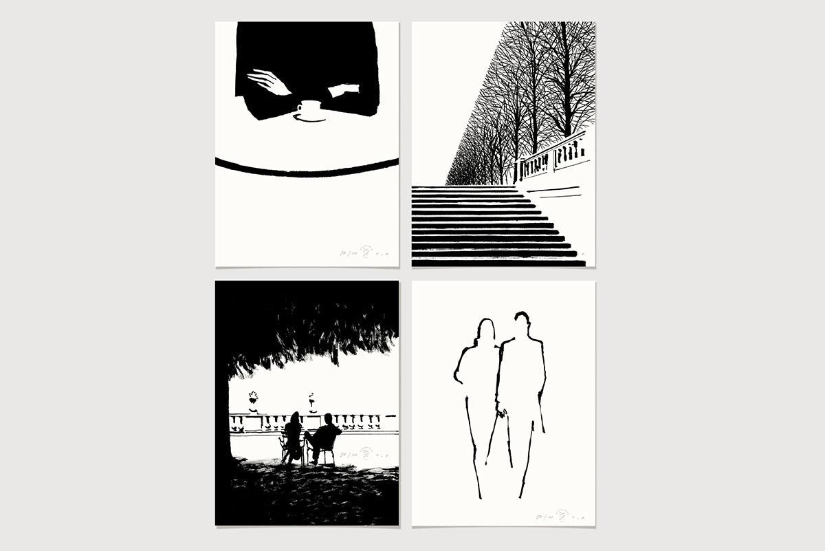 Édition limitée de 4 dessins délicats, tirés du livre Quelque part dans Paris. Chaque dessin capture une scène fugace – un regard, un geste, le silence entre deux passants. Autant de poèmes cinématographiques à offrir ou à garder tout près de soi.