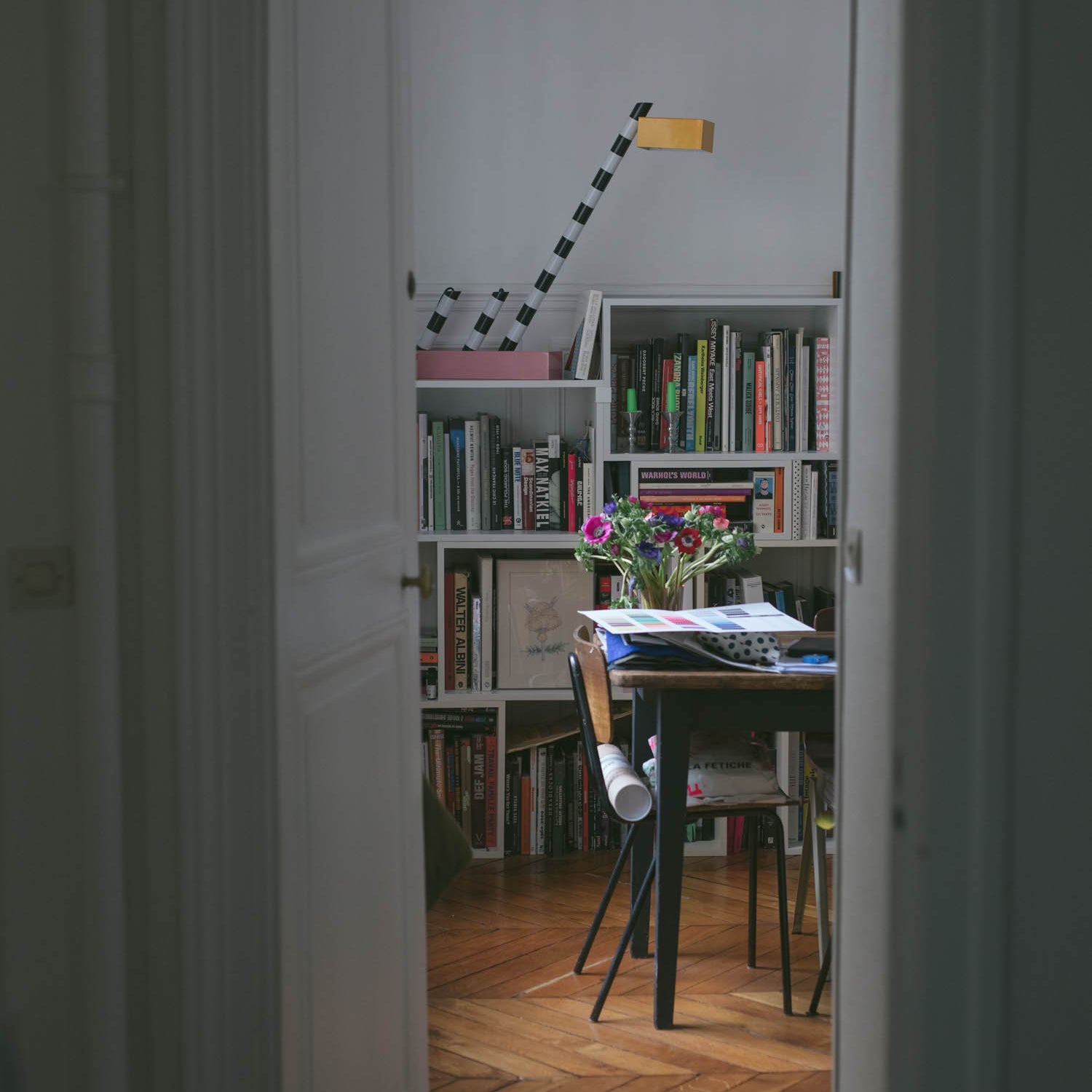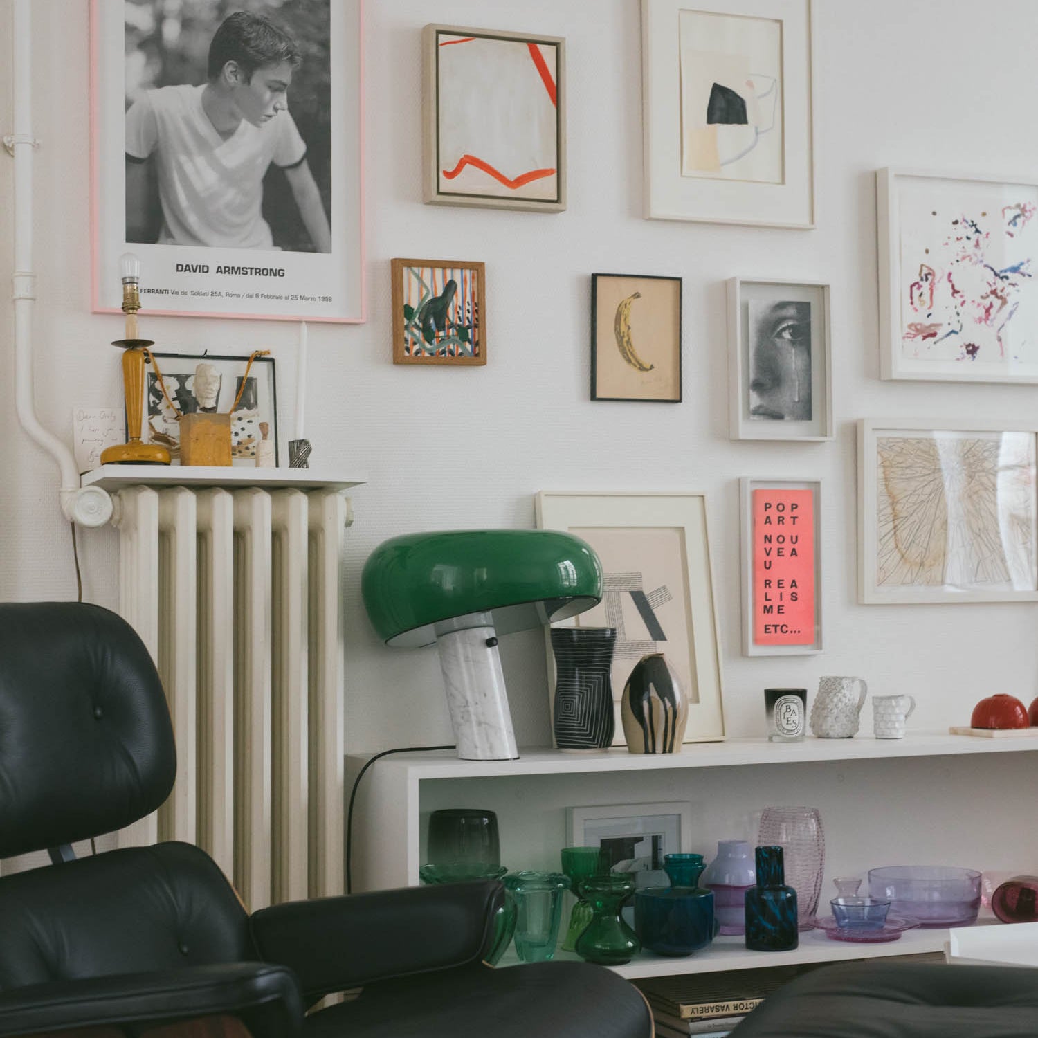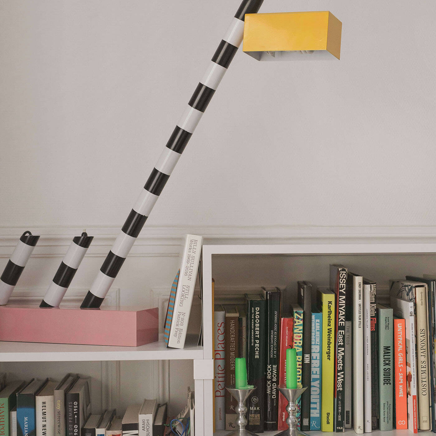 The focus here is inspired by graphics and colors — white, red, pink, blue, green, yellow, black. Every detail creates a vibration and an emotion. On the shelves sit books such as the work of Jim Lambie, alongside pieces by Walter Price, Elizabeth Peyton, David Hockney, and Anne Collier.
