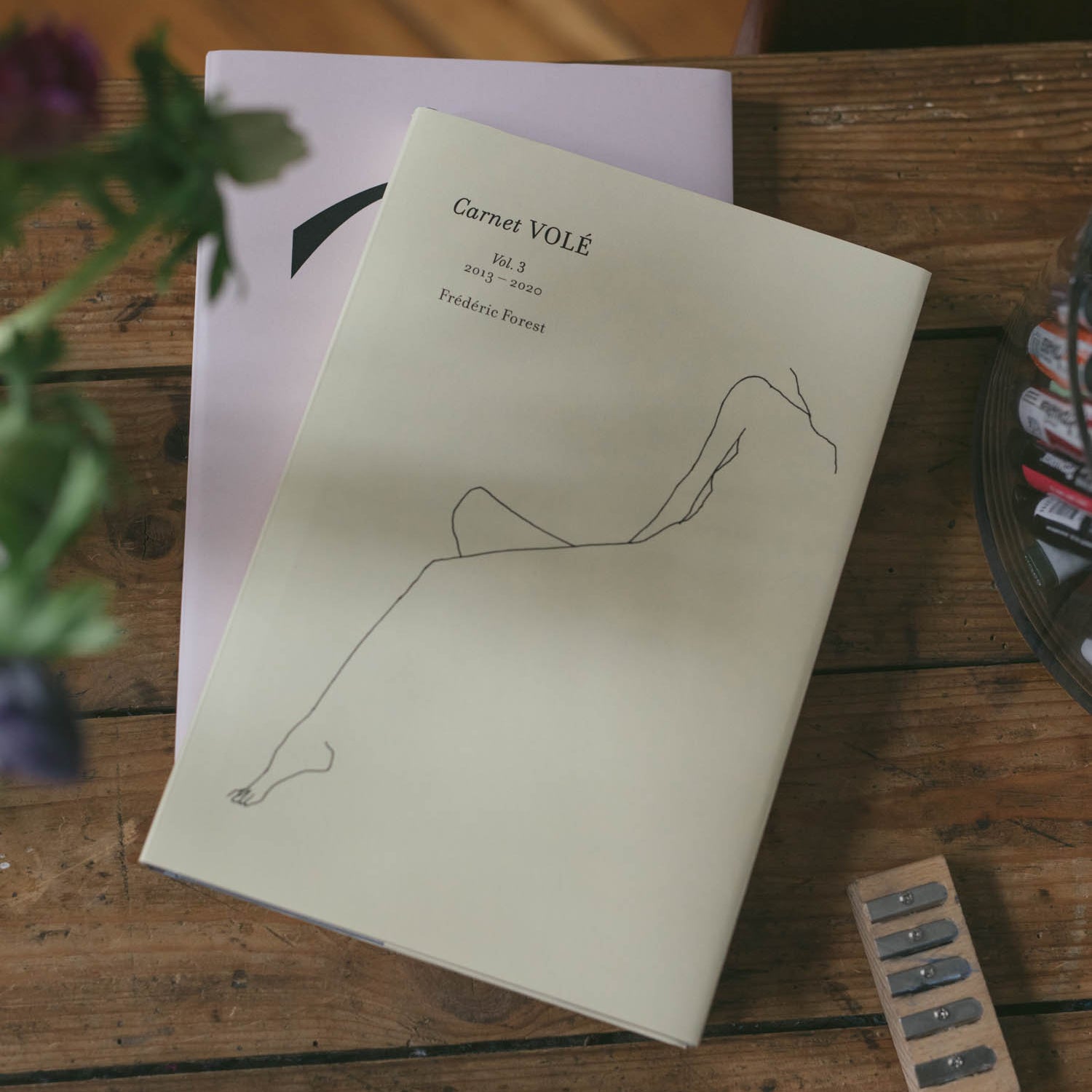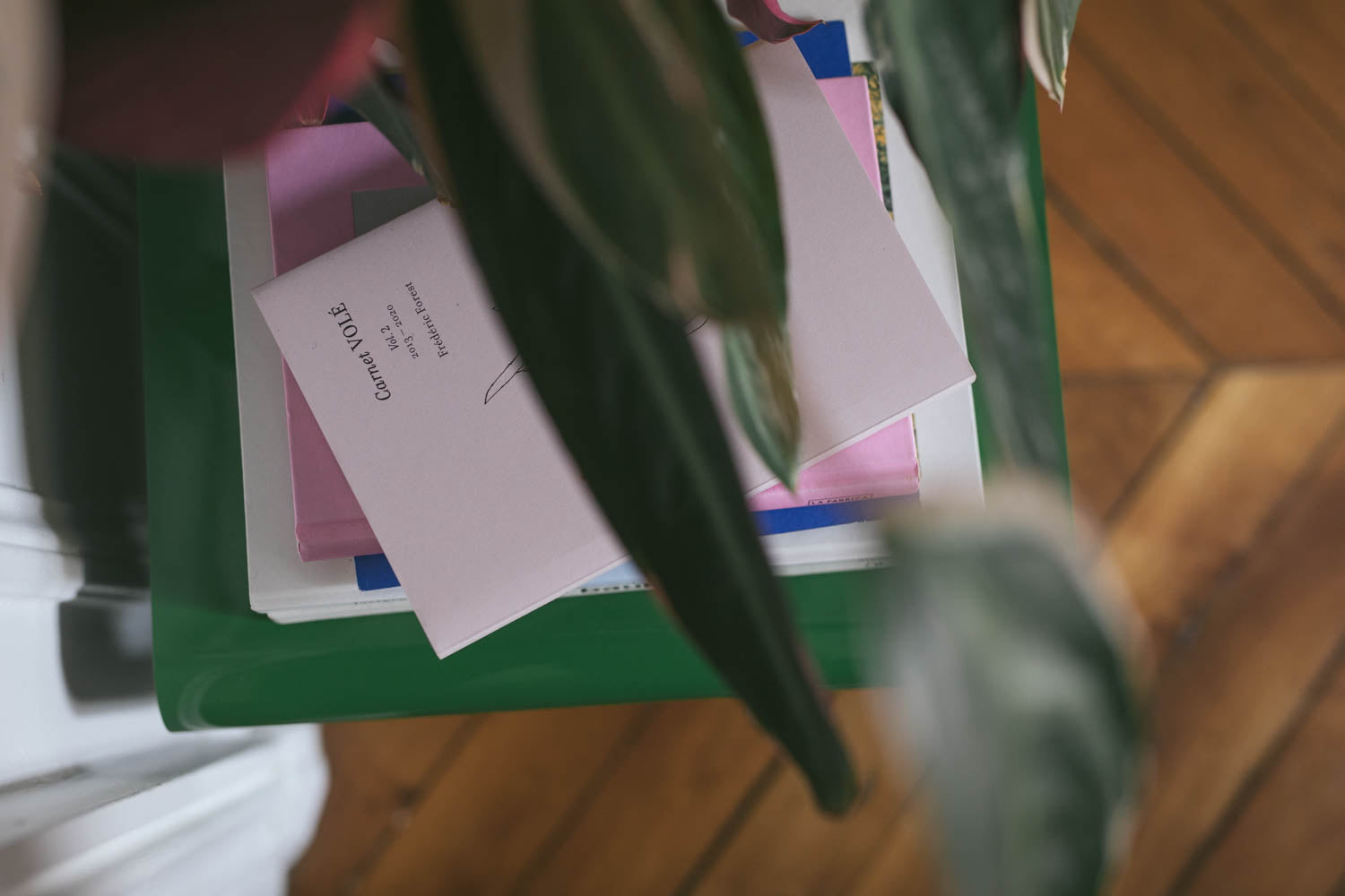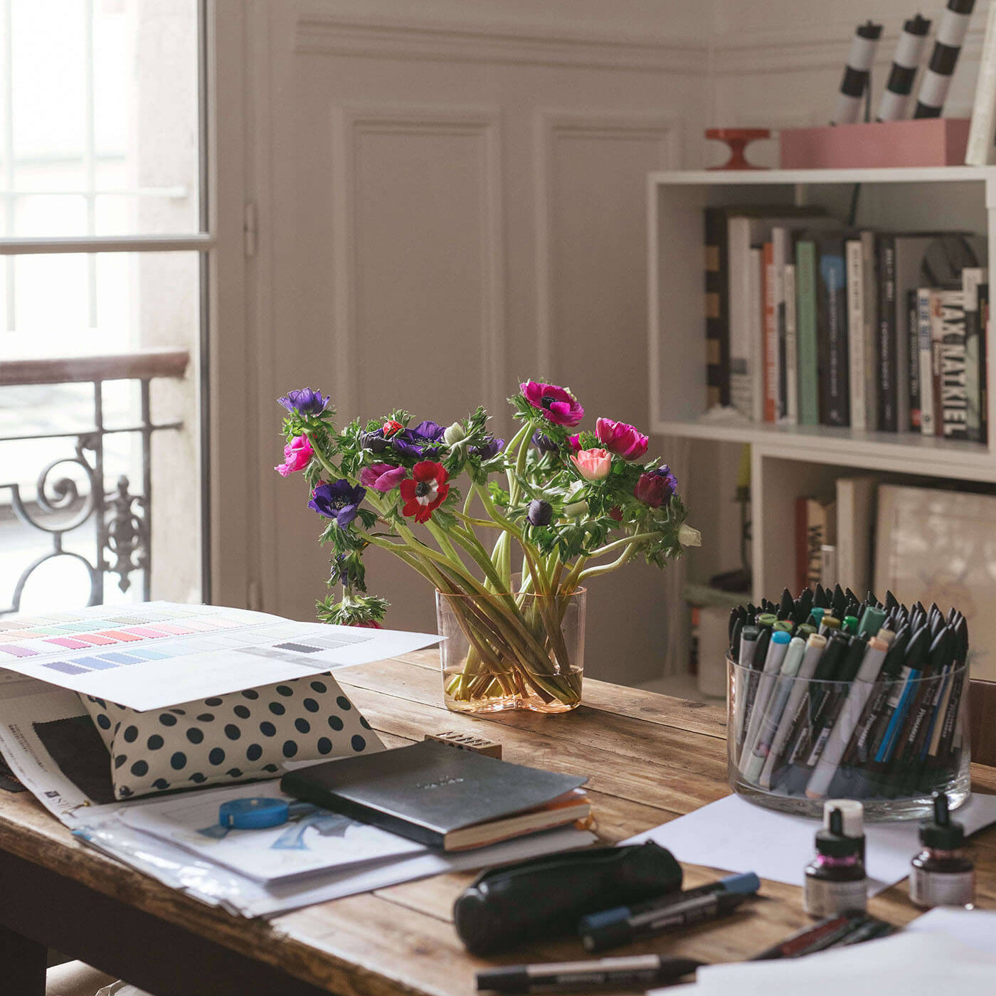 The focus here is inspired by graphics and colors — white, red, pink, blue, green, yellow, black. Every detail creates a vibration and an emotion. On the shelves sit books such as the work of Jim Lambie, alongside pieces by Walter Price, Elizabeth Peyton, David Hockney, and Anne Collier.