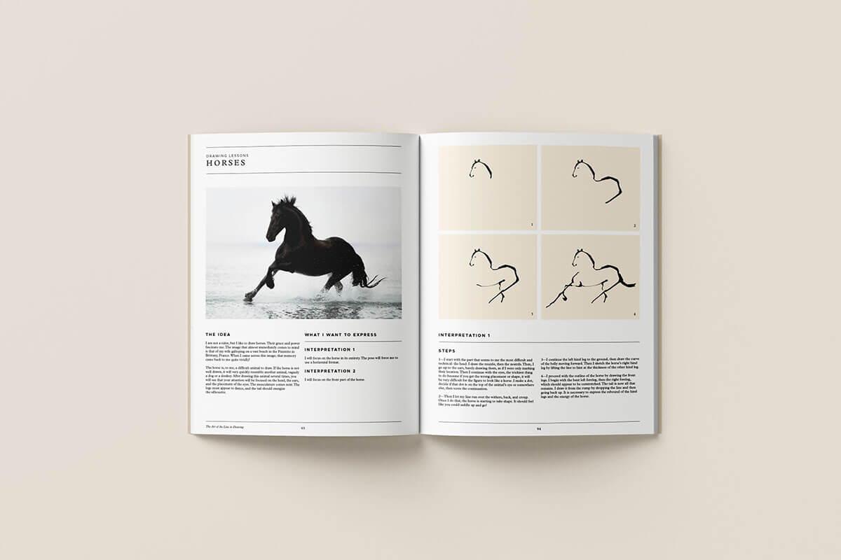 The Art of the Line in Drawing présente un aperçu de sa technique et de son processus créatif, suivi d'une série de leçons progressives organisées par sujet.
